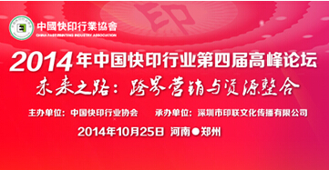由中國快印行業(yè)協(xié)會主辦,深圳市印聯(lián)文化傳播有限公司承辦的中國快印行業(yè)一年一度的級別較高、規(guī)模較大的“2014年中國快印行業(yè)第四屆高峰論壇”將于10月在河南鄭州盛大召開!本屆論壇以“跨界營銷與資源整合”為主題,屆時將邀請相關(guān)部門負責(zé)人、快印行業(yè)資深專家以及快印企業(yè)總裁等,就當(dāng)前快印行業(yè)發(fā)展現(xiàn)狀及未來發(fā)展趨勢等焦點課題展開深入交流與互動!